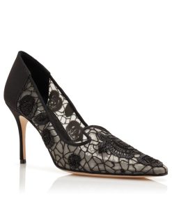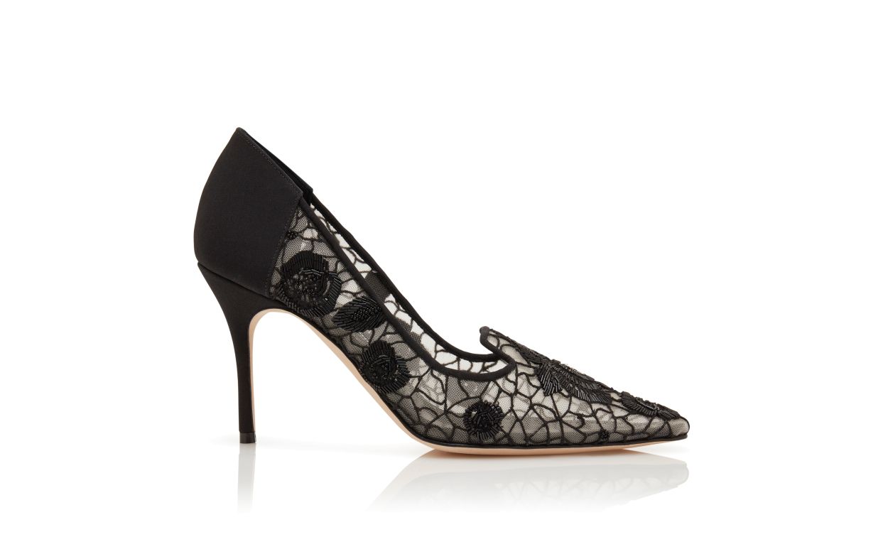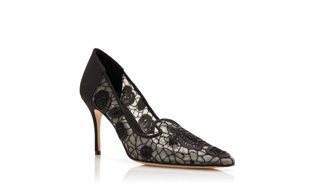 Black mesh pointed toe pumps featuring floral embroidered design, black satin counter detail and stiletto high heel.Upper: 100% polyamide. Sole: 100% calf leather. Lining: 100% polyamide. Heel measures 90 mm. Made in Italy.