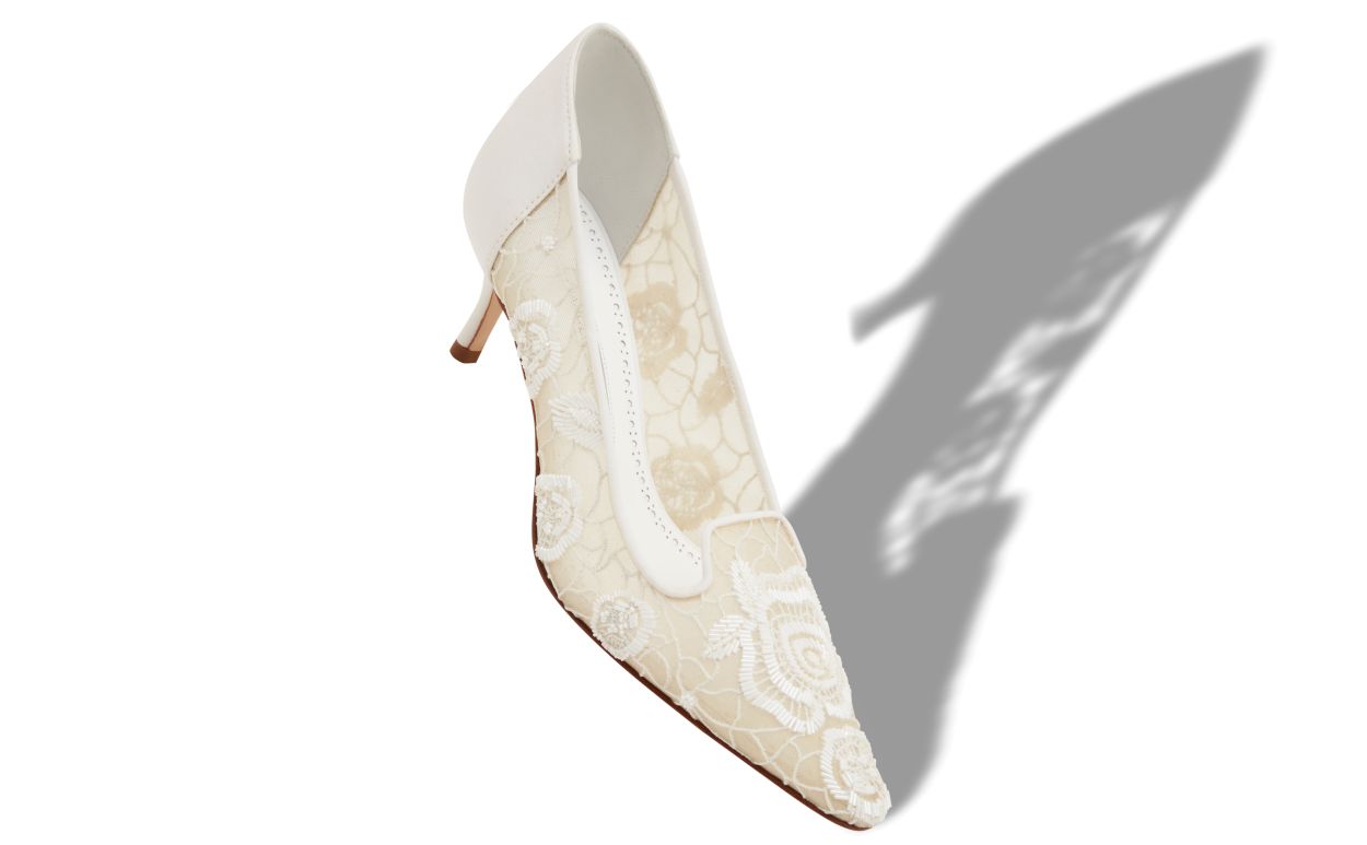 White mesh pointed toe pumps featuring floral embroidered design, white satin counter detail and stiletto low heel.Upper: 100% polyamide. Sole: 100% calf leather. Lining: 100% polyamide. Heel measures 50 mm. Made in Italy.