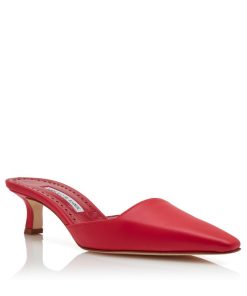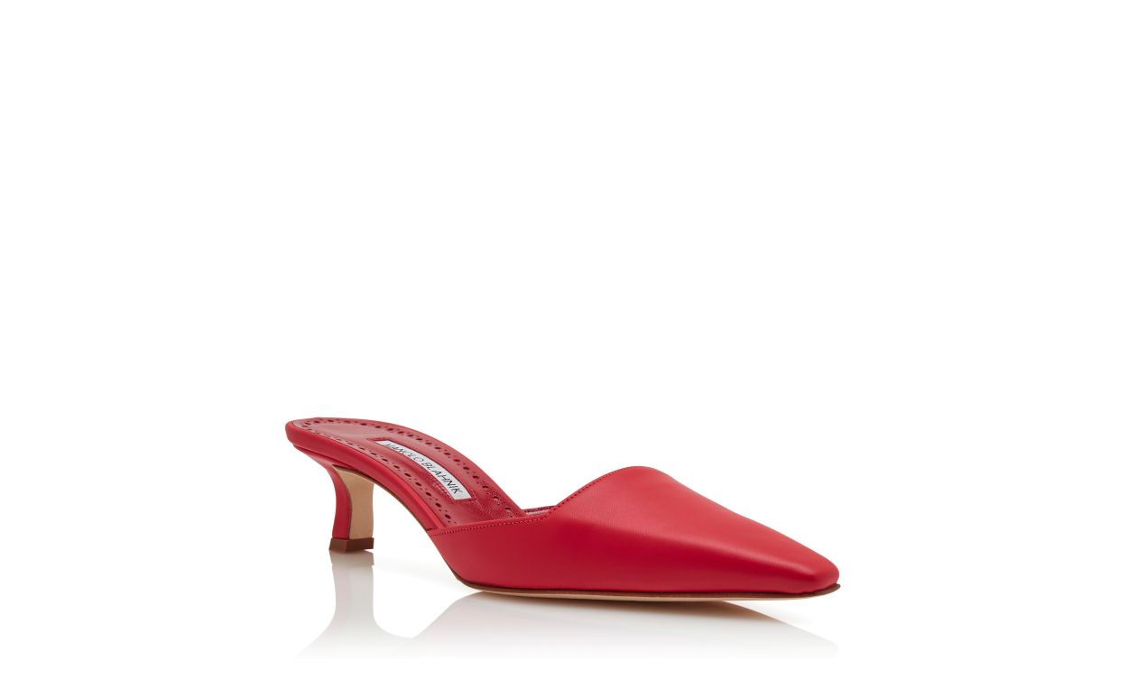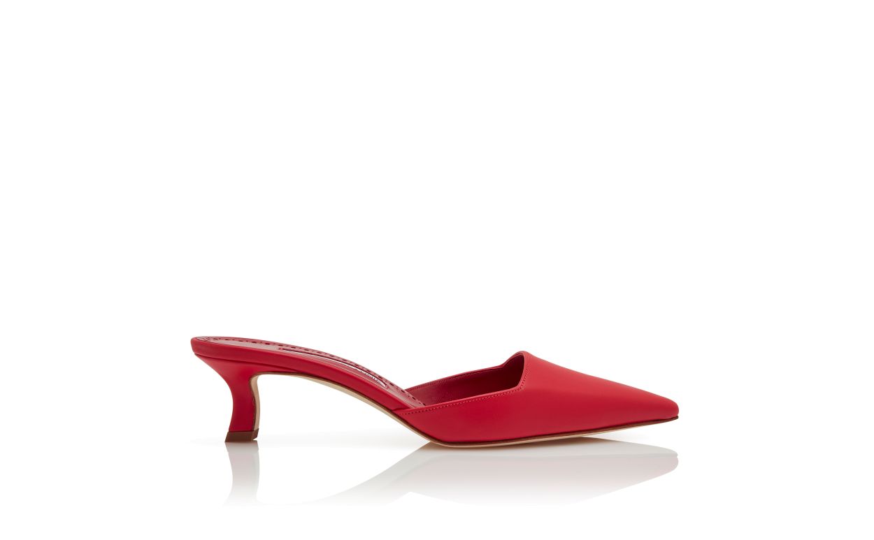 Red nappa leather pointed toe mules featuring square cut design and flared block low heel.Upper: 100% lamb nappa. Sole: 100% calf leather. Lining: 100% kid leather. Heel measures 50 mm. Italian sizing. Made in Italy.