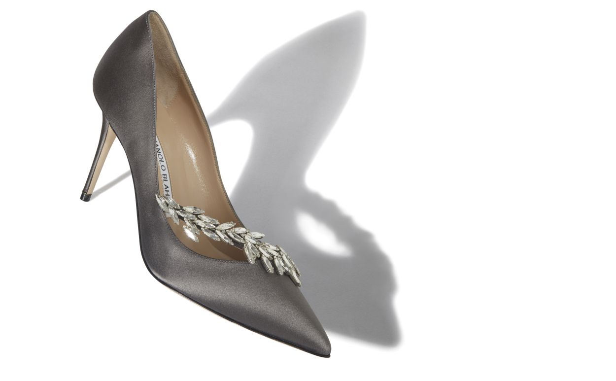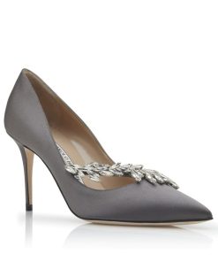 Grey satin pointed toe court shoes featuring an asymmetrical crystal leaf embellishment and stiletto high heel. Upper: 68% viscose, 32% silk. Sole: 100% cow leather. Lining: 100% kid leather. Heel measures 90 mm. Made in Italy.
