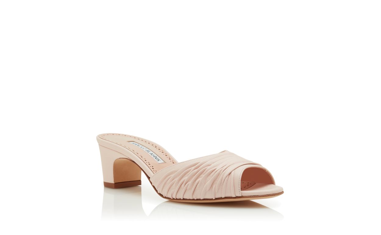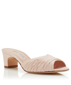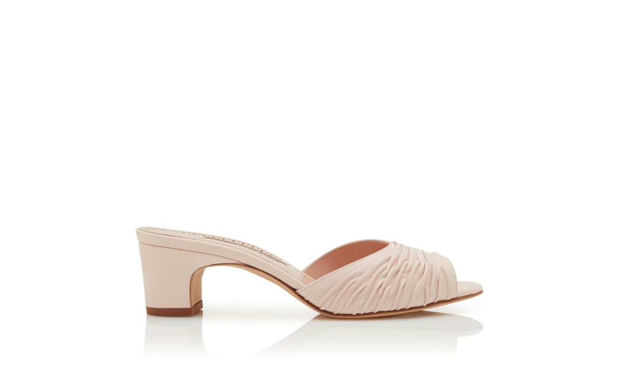 Beige nappa leather open toe mules featuring ruched details and low block heel.Upper: 100% lamb nappa. Sole: 100% calf leather. Lining: 100% kid leather.Heel measures 50 mm.Italian sizing.Made in Italy.