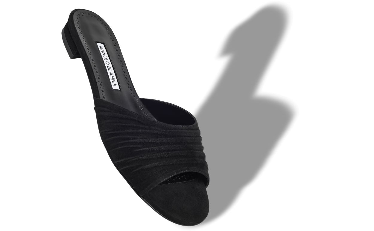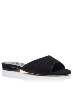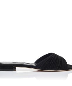 Black suede open toe flat sandals featuring ruched strap and flat stacked heel.Upper: 100% kid suede. Sole: 100% calf leather. Lining: 100% kid leather.Heel measures 10 mm.Italian sizing.Made in Italy.