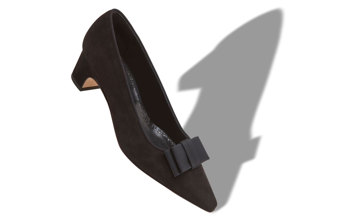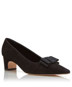 Black suede pointed toe pumps featuring black decorative bow detail, tonal grosgrain trim and block low heel.Upper: 100% kid suede. Sole: 100% calf leather. Lining: 100% kid leather.Heel measures 50 mm.Italian sizing.Made in Italy.