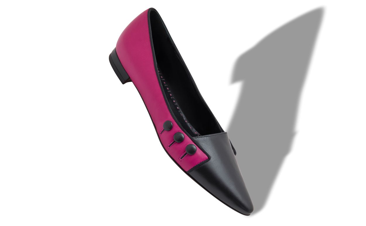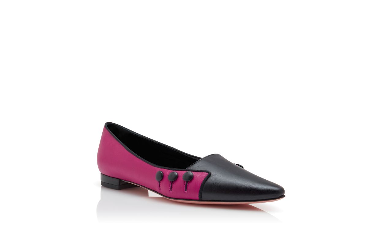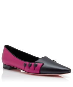 Dark pink nappa leather pointed toe flat pumps featuring black toe cap, edging and decorative buttonhole design with buttons. Finished with flat stacked heel.Upper: 100% lamb nappa. Sole: 100% calf leather. Lining: 100% kid leather. Heel measures 10 mm. Italian sizing. Made in Italy.