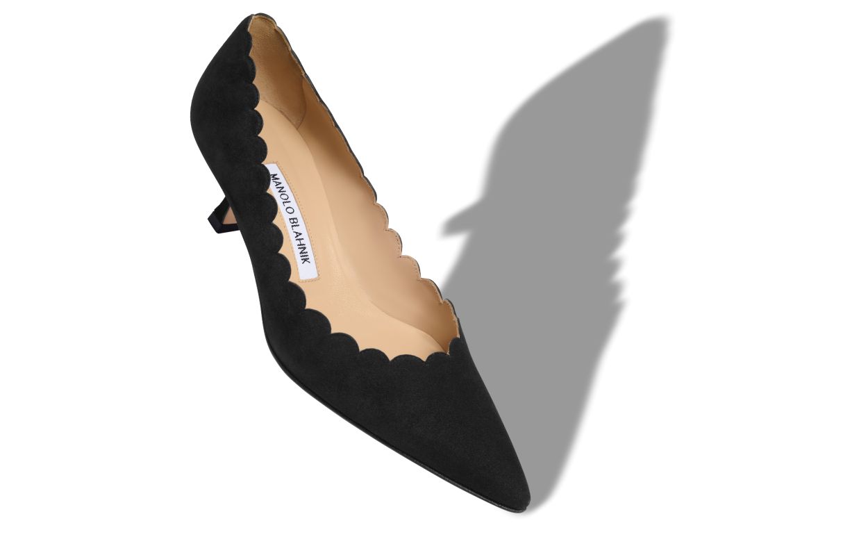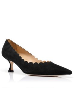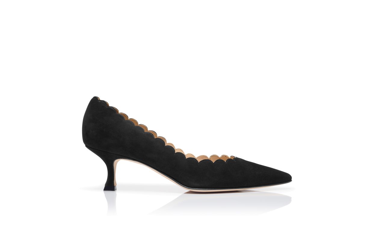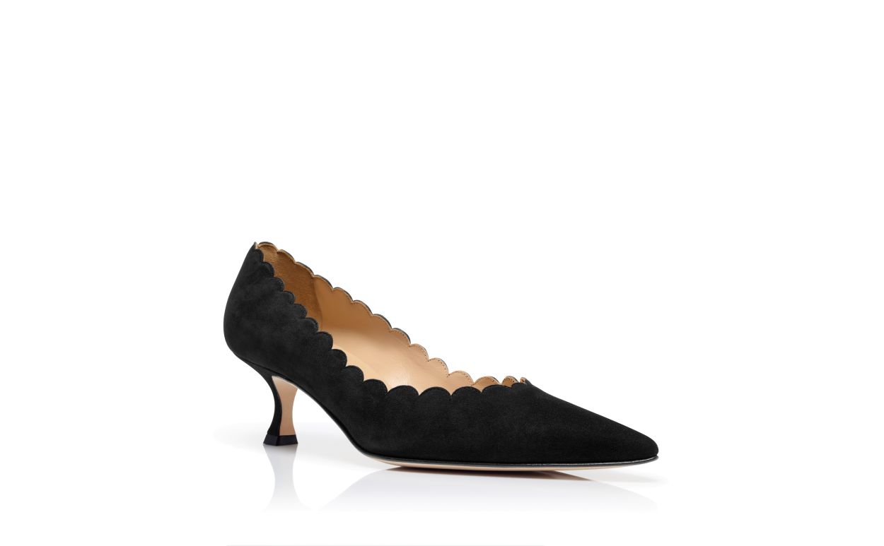 Black suede pointed toe pumps featuring scalloped edging and stiletto low heel.Upper: 100% kid suede. Sole: 100% calf leather. Lining: 100% kid leather.Heel measures 50 mm.Italian sizing.Made in Italy.