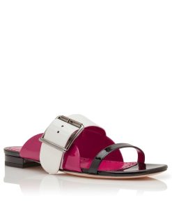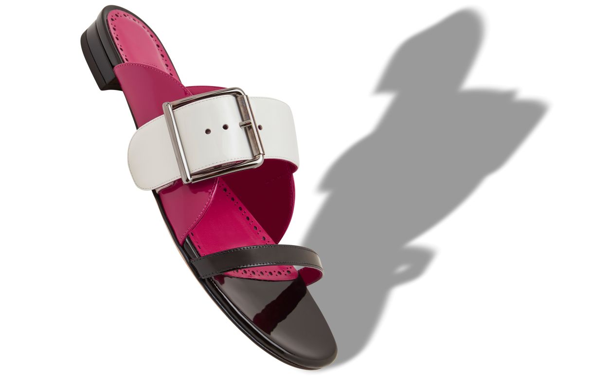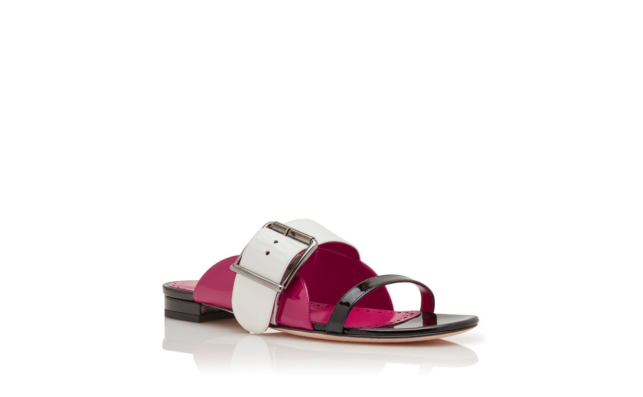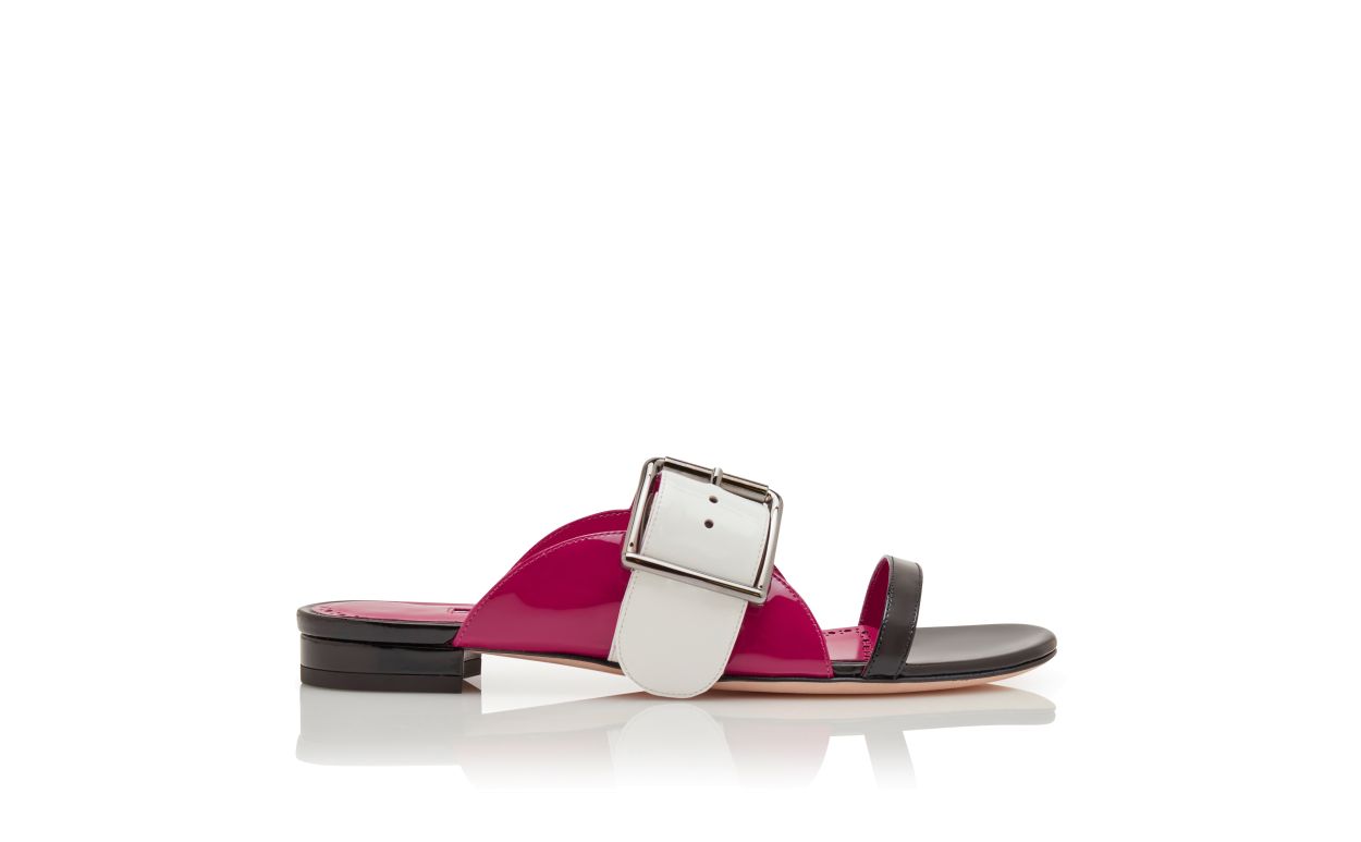 Black and pink patent leather open toe sandals featuring white instep strap with decorative buckle closure and flat stacked heel.Upper: 100% patent calf. Sole: 100% calf leather. Lining: 100% kid leather. Heel measures 10 mm. Italian sizing. Made in Italy.