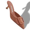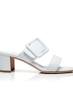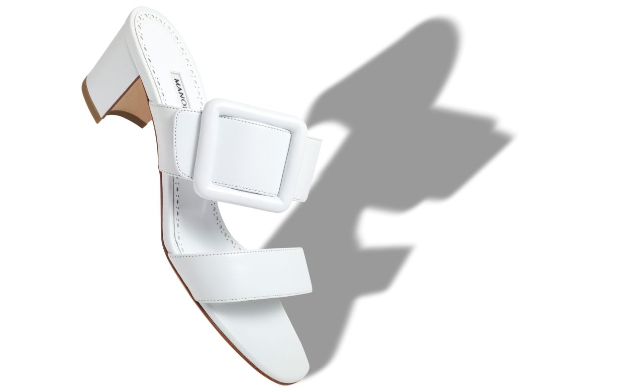 White nappa leather open toe mules featuring decorative buckle detail and finished with mid block heel.Upper: 100% lamb nappa. Sole: 100% calf leather.Lining: 100% kid leather. Heel measures 50 mm. Italian sizing. Made in Italy.