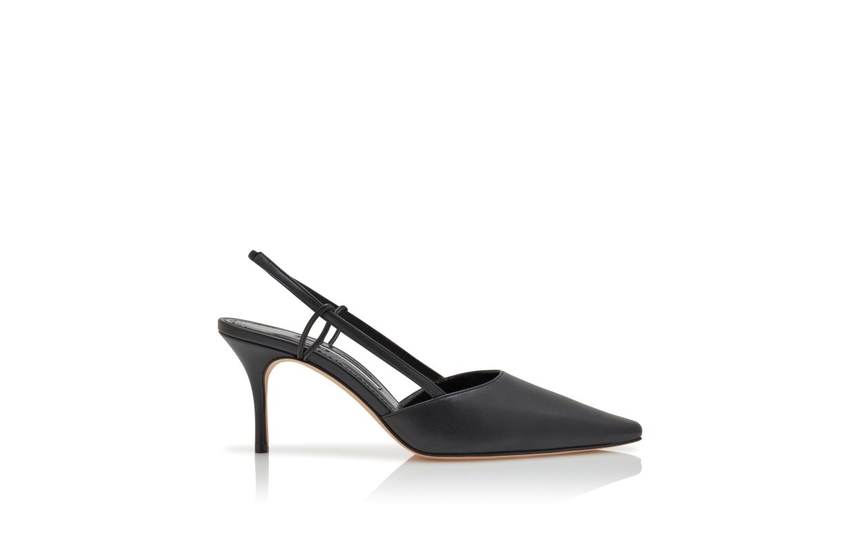 Black nappa leather pointed toe slingback pumps featuring elasticated slingback design with decorative hooks and stiletto mid heel.